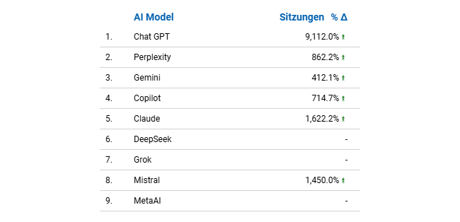 Denn was vermutlich alle Websitebetreiber in den vergangenen Monaten feststellen, ist, dass der Traffic, der von Chatbots auf die eigene Website kommt rapide wächst. Year-to-date sehen wir bei vielen Projekten häufig Wachstumsraten von mehreren Tausend Prozent.