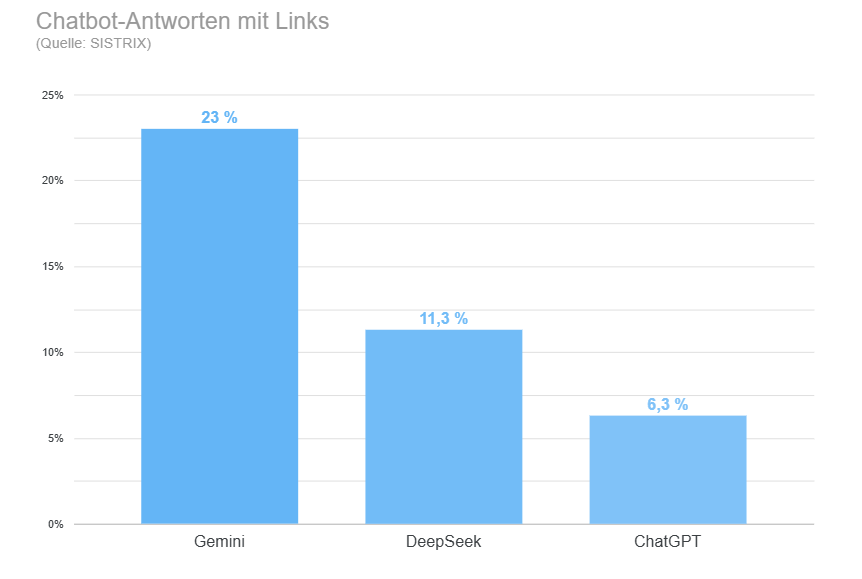 ChatGPT, der Marktführer unter den LLMs, lieferte in dieser Studie sogar nur in rund 6 % aller Antworten einen Link. DeepSeek in rund 11 % der Fälle. Googles Gemini hingegen 23 %.