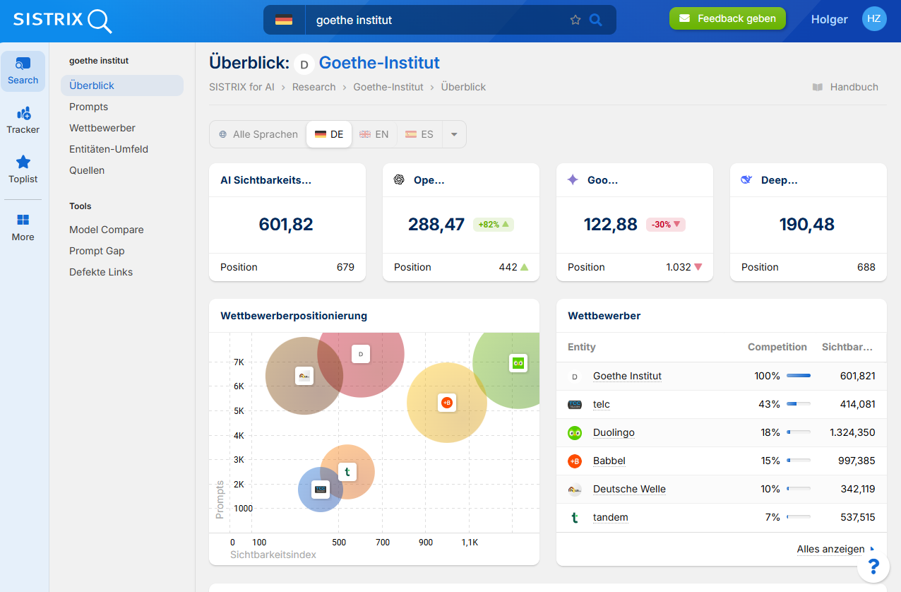 Mit externen AI-Analysetools wie SISTRIX lassen sich die Datenpunkte untersuchen, die aus der Interaktion mit Chatbots entstehen. Für Marken wird dadurch sichtbar, mit welchen Prompts Menschen in Systemen wie ChatGPT, Perplexity oder Gemini arbeiten, in welchem Kontext und Stimmungsumfeld die eigene Marke auftaucht und wie diese Antworten ausgestaltet sind.